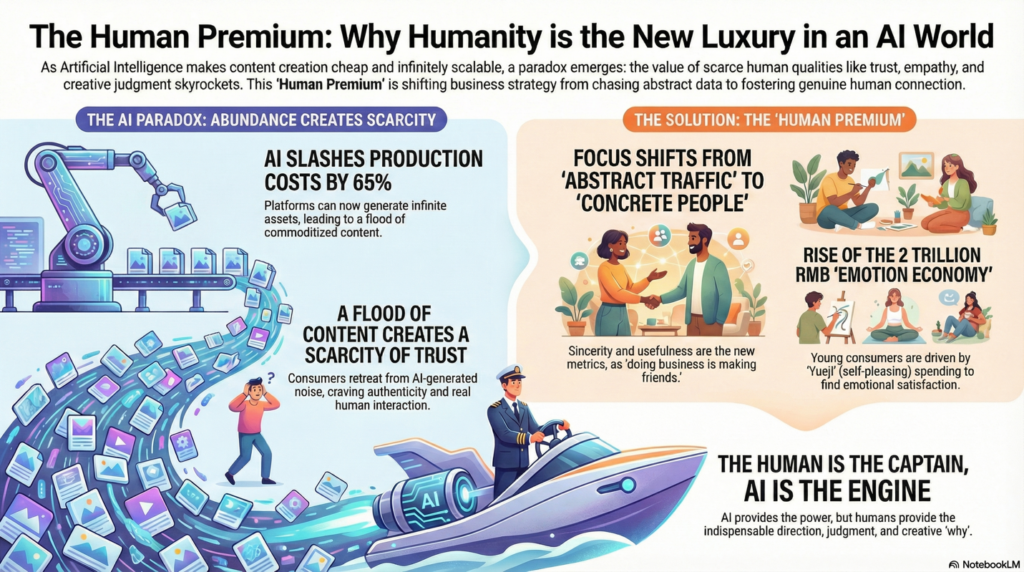 As AI commoditizes content creation and industrializes efficiency, the advertising industry is witnessing a powerful counter-trend: the skyrocketing value of authentic human connection, empathy, and “concrete” reality. While platforms like Kuaishou and Ocean Engine demonstrate how AI can reduce production costs by 65% and generate infinite assets, industry leaders argue that this very abundance creates a scarcity of trust and emotional resonance. The presentations reveal a strategic pivot from chasing abstract “traffic” to connecting with “concrete people”—a philosophy championed by Xiaohongshu (rednote), which posits that in an algorithmic world, “sincerity” and “altruism” are the only metrics that matter. This “Human Premium” is not just a sentimental preference but an economic driver, fueling China’s 2 trillion RMB “emotion economy” where young consumers spend to please themselves (“Yueji”) and find shared cultural consensus. Ultimately, while AI may serve as the engine for execution, the presentations from Dentsu, Ogilvy, and Focus Media conclude that the “human captain” remains indispensable for providing the moral judgment, creative “why,” and emotional warmth that machines cannot replicate.